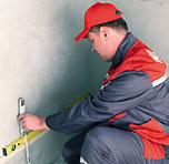Шаг 1. Удаляем непрочные элементы основания и очищаем его от грязи и пыли. Прикладывая рейку длиной 2 м. и уровень, проверяем все отклонения стены от вертикали (для полов – горизонтали).